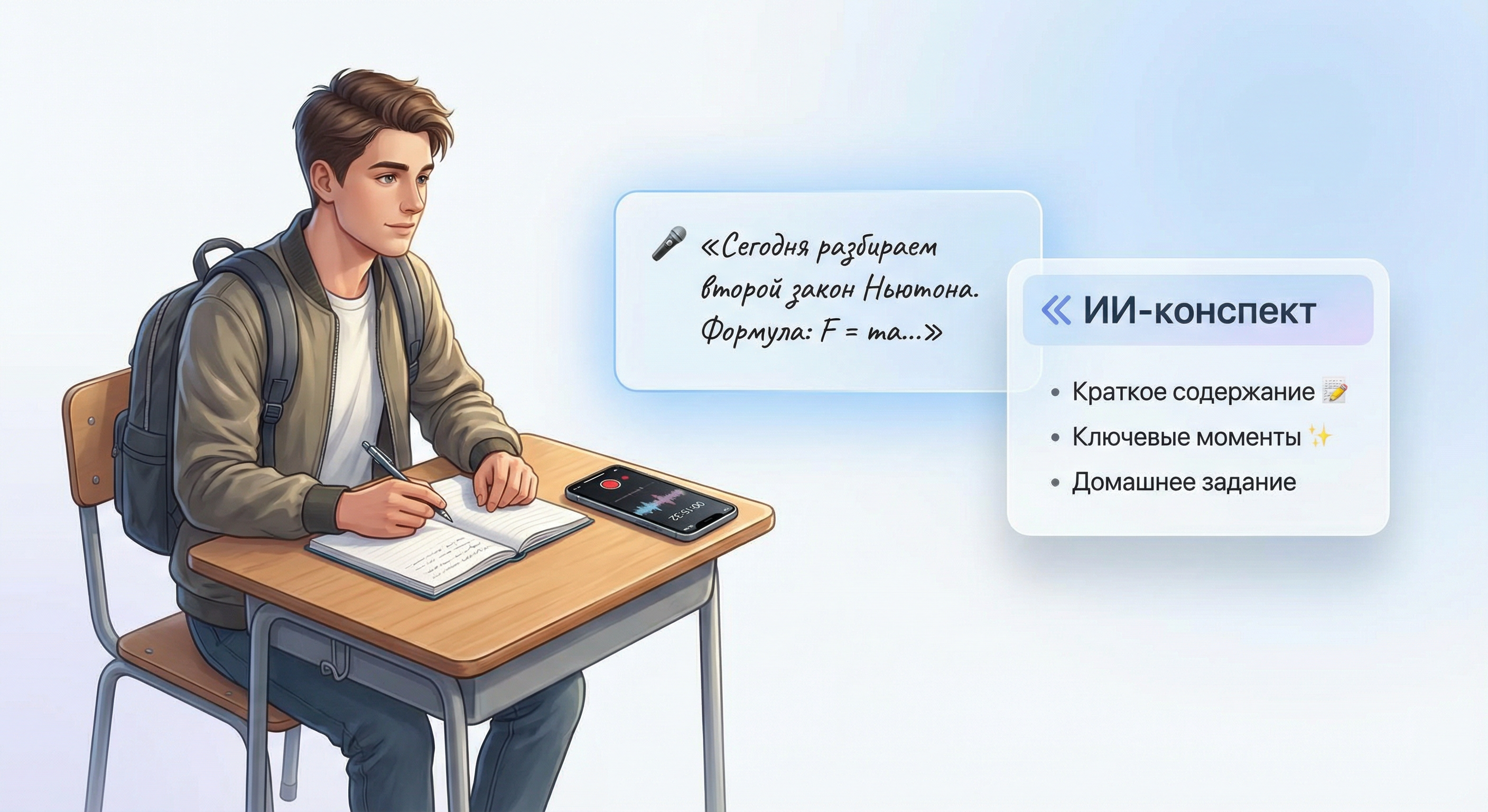 Student AI распознает речь и превращает лекцию в аккуратный конспект простым, понятным языком.